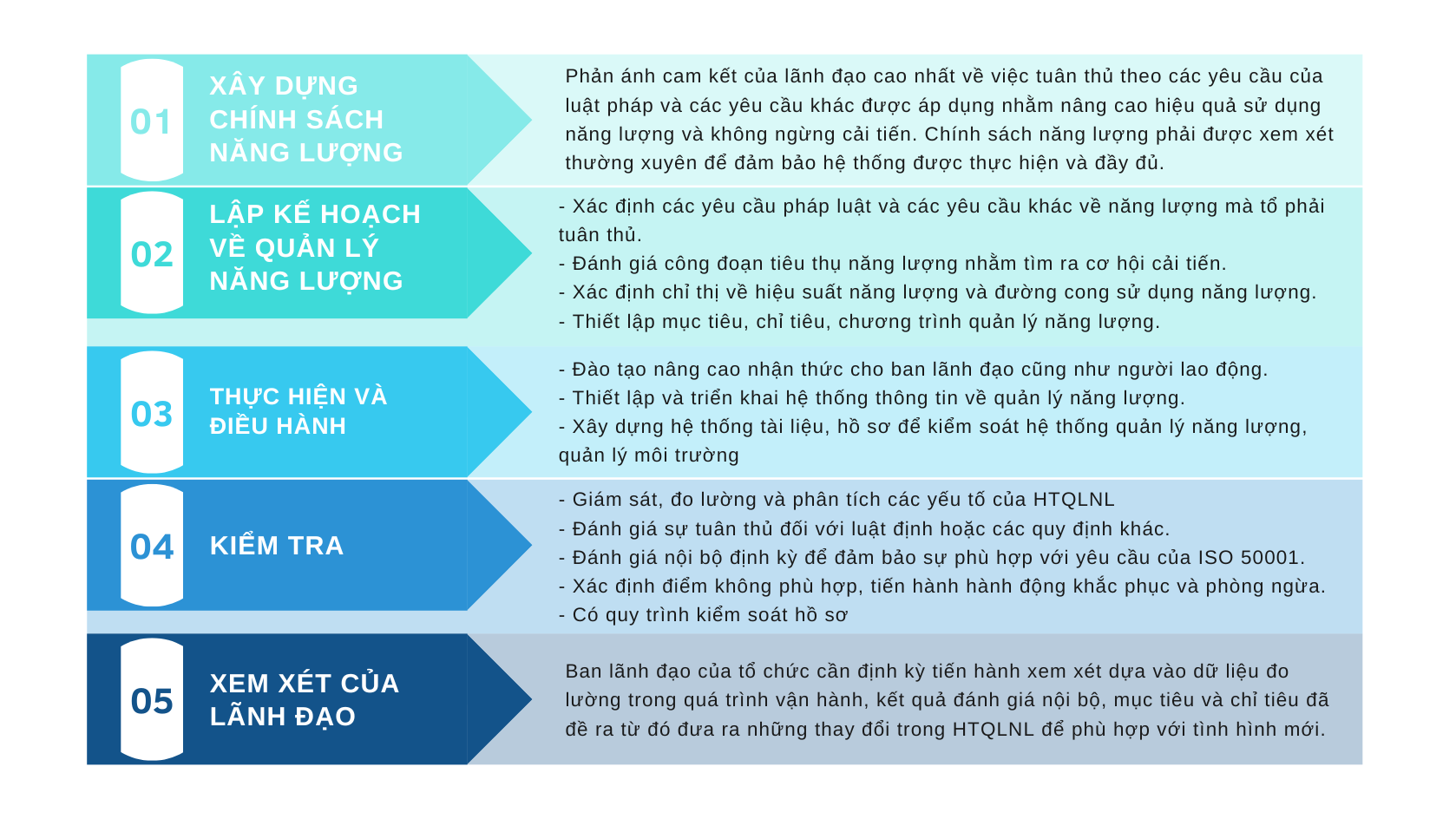 Chu trình Plan-Do-Check-Act (PDCA) có thể áp dụng cho tất cả các quy trình và cho toàn bộ hệ thống quản lý năng lượng ISO 50001, cụ thể là: