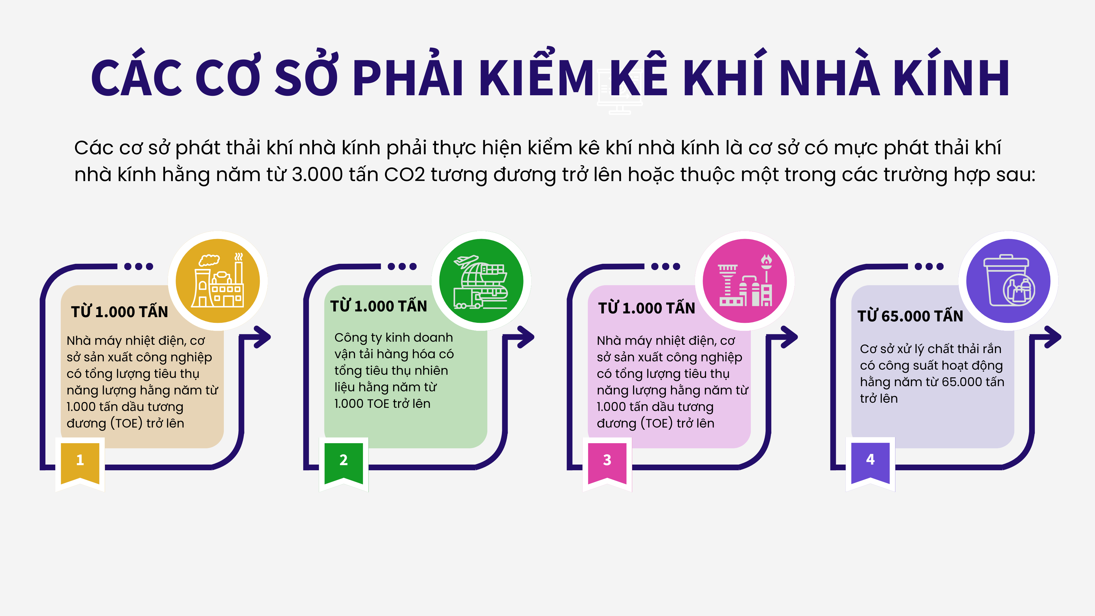 Các cơ sở phát thải khí nhà kính phải thực hiện kiểm kê khí nhà kính là cơ sở có mực phát thải khí nhà kính hằng năm từ 3.000 tấn CO2 tương đương trở lên hoặc thuộc một trong các trường hợp sau: