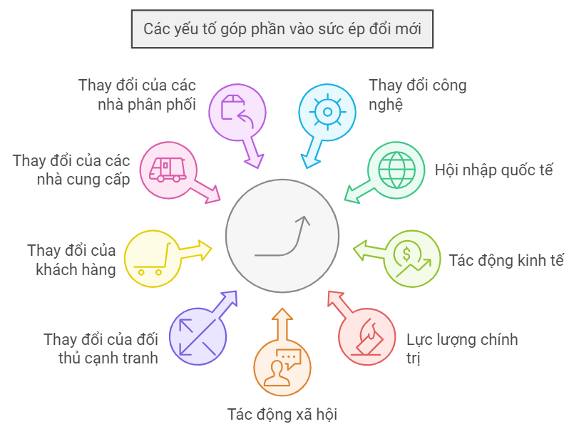 Những đổi mới chủ yếu bắt nguồn từ môi trường trực tiếp, đặc biệt là sự thay đổi nhanh chóng của đối thủ cạnh tranh trong ngành, đối thủ cạnh tranh tiềm năng và nhu cầu của khách hàng. Những thay đổi của các lực lượng này bắt buộc mỗi tổ chức, mỗi doanh nghiệp phải tự đổi mới các sản phẩm dịch vụ nhằm giành được lợi thế cạnh tranh và giá trị gia tăng một cách bền vững.
