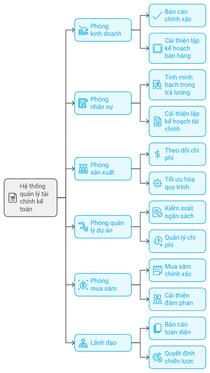 Khi thiết lập hệ thống quản lý tài chính kế toán, không chỉ phòng tài chính kế toán hưởng lợi mà các phòng ban khác trong công ty cũng sẽ được cải thiện hiệu suất hoạt động và tối ưu hóa quy trình làm việc. Dưới đây là ảnh hưởng và lợi ích tới từng phòng ban: